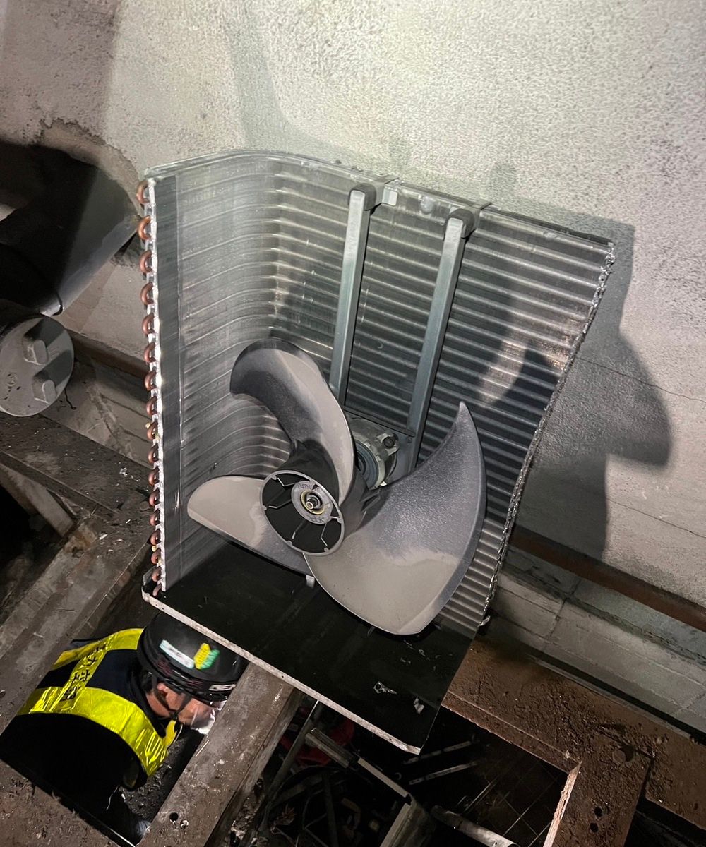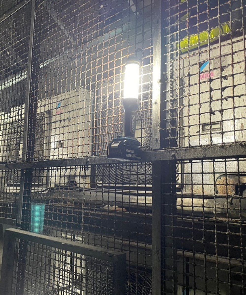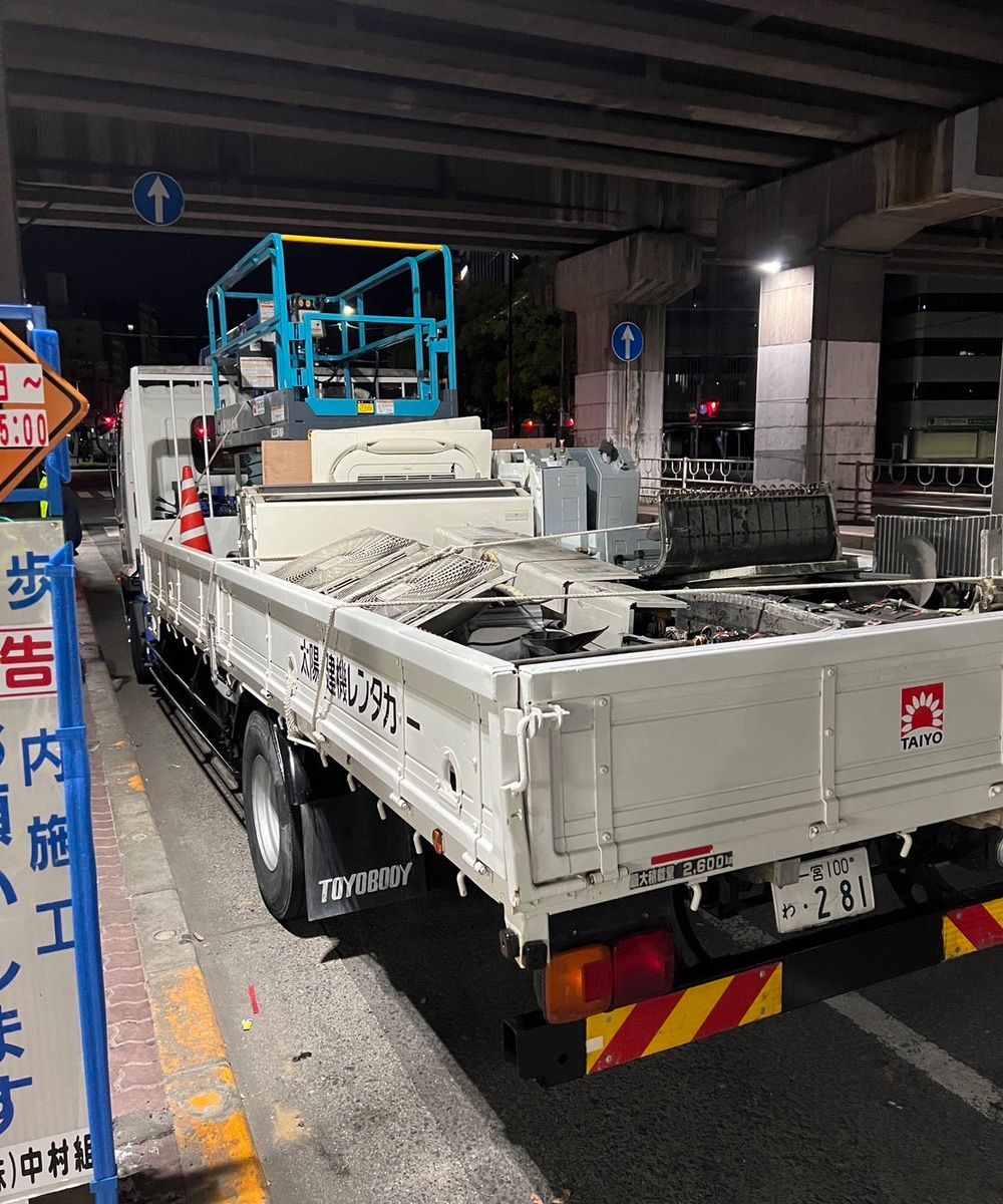 某駅にて空調機撤去工事を行いました。高架上で通常搬出不可能な為、冷媒ガス回収工事を行い、室外機を専用工具にて切断し無事搬出出来ました。